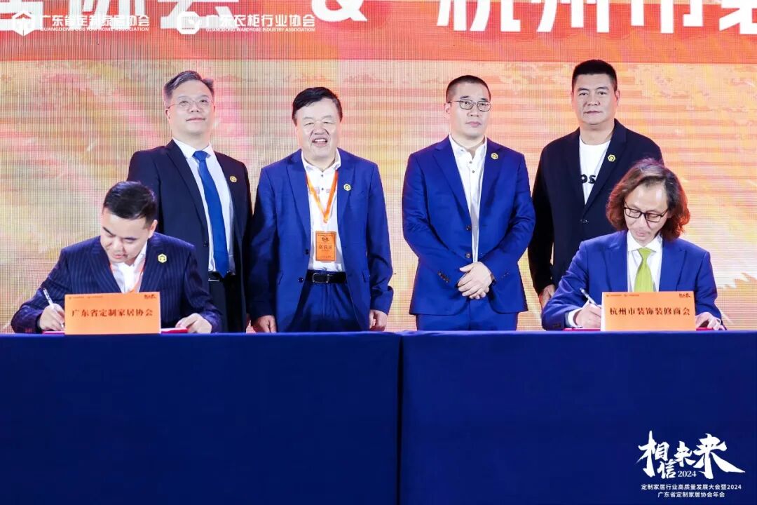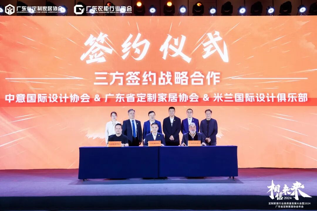 除了和中意国际设计协会和米兰国际设计俱乐部缔结了进一步的合作空间以及链接以外,协会也将与杭州市装饰装修商会进一步进行紧密的商协会战略合作;并在广东省定制家居协会会长李嘉聪、广东衣柜行业协会会长张健、广东省定制家居协会荣誉会长张挺、广东衣柜行业协会荣誉会长、中意国际设计协会名誉会长林涛的见证下,协会秘书长曾勇与杭州市装饰装修商会秘书长、杭派家装发起人陈忆进行签约仪式。
