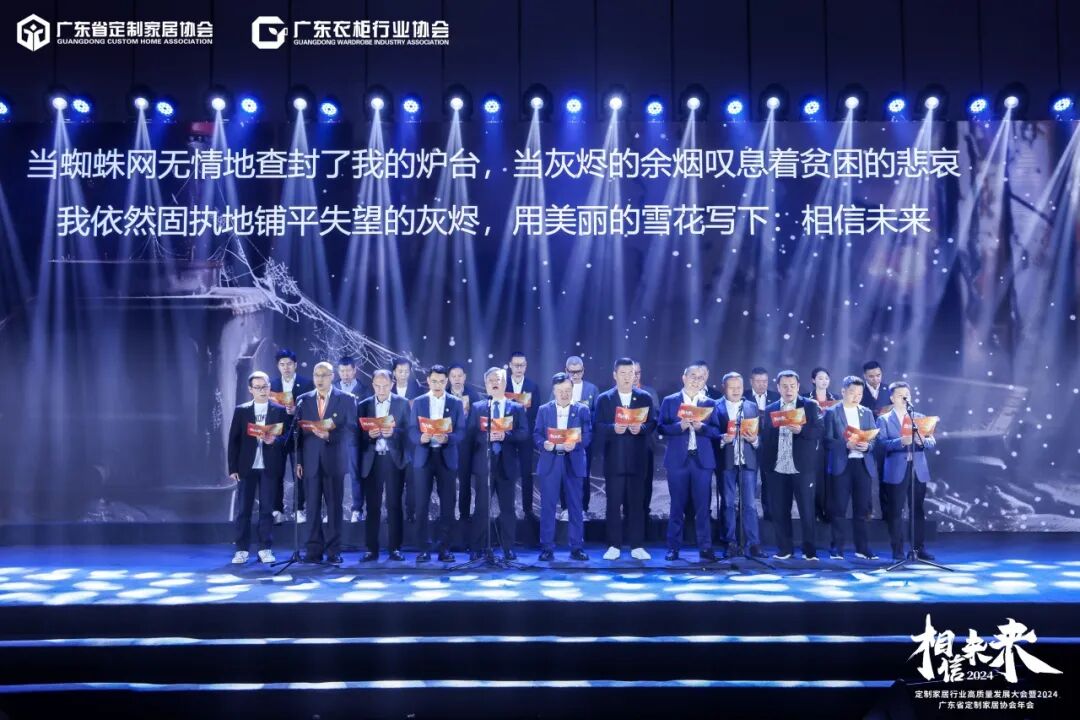 晚宴开始,我们新的领导班子为大家朗诵诗歌《相信未来》,“朋友们,请坚定地相信未来吧!”铿锵有力的文字宣示着我们家居人的热忱与真挚的情感,热爱行业、热爱定制!