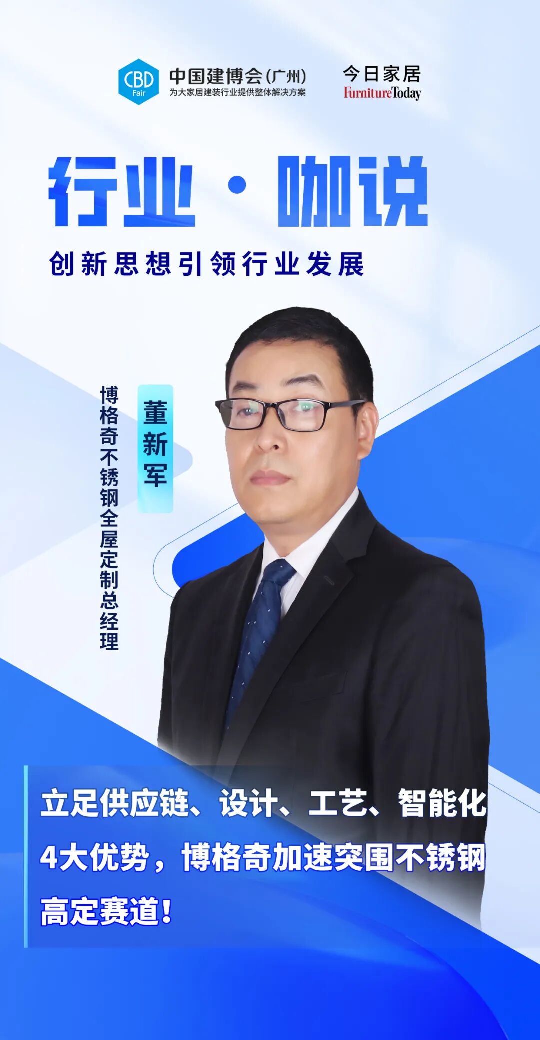 本期「行业·咖说」,中国建博会(广州)联合今日家居走进不锈钢高定代表品牌——博格奇,对话博格奇不锈钢全屋定制总经理董新军先生,分析博格奇如何以供应链、设计、工艺技术、智能化建设这4大发展优势为核心,打造品牌差异化价值,在不锈钢高定赛道突围?