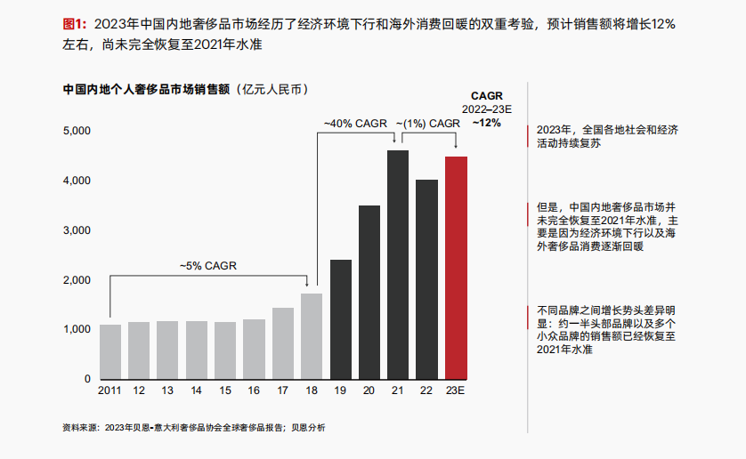 贝恩咨询发布的《2023年中国奢侈品市场报告》印证了这一结论。报告显示,即便各种不利因素的影响,2023年中国高端消费品市场仍然收获11%的增长,达6077亿元。中国在全球高端消费品市场的占比维持在22%左右,依然是高端消费品牌最重要的市场之一。
