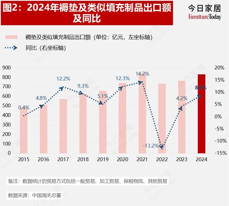 2024年1~12月,我国褥垫及类似填充制品的出口额为830.96亿元人民币,增长8.8%,高于同期出口整体增速1.7个百分点。