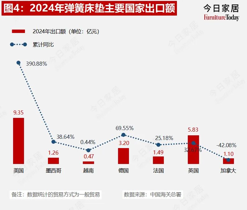2024年弹簧床垫累计出口额84.9亿元,同比增长28.27%。韩国、澳大利亚及美国是该品类最大的出口国,占总出口额比重13%、12%和11%。韩国同比增速131.02%,美国暴增390.88%。
