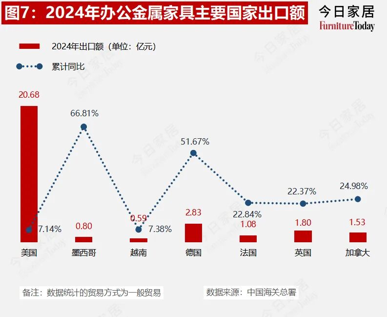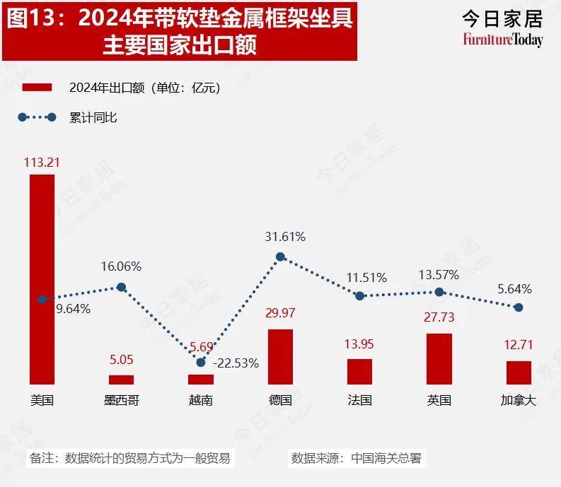 今日家居对主要家具品类,以及重要出口国的数据进一步分析,2024年中国对德国的增速最快,同比增长30.71%;对越南出口额下滑16.87%。