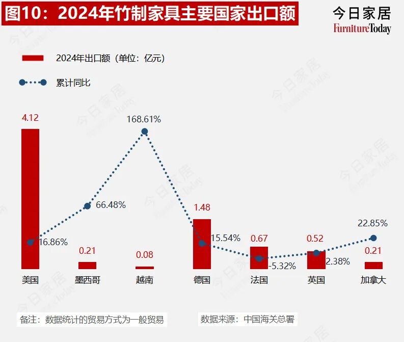 2024年竹制家具累计出口额13.01亿元,同比增长18.34%。美国和德国是该品类最大的出口国,占总出口额比重32%和11%。越南同比增长168.61%,美国同比增长16.86%。