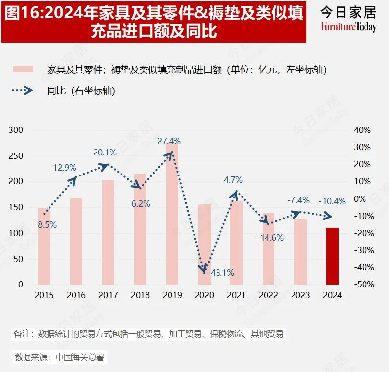 2024年我国家具及其零件&褥垫及类似填充制品进口总额为115.89亿元,近三年持续下滑,2024年同比下滑10.4%。