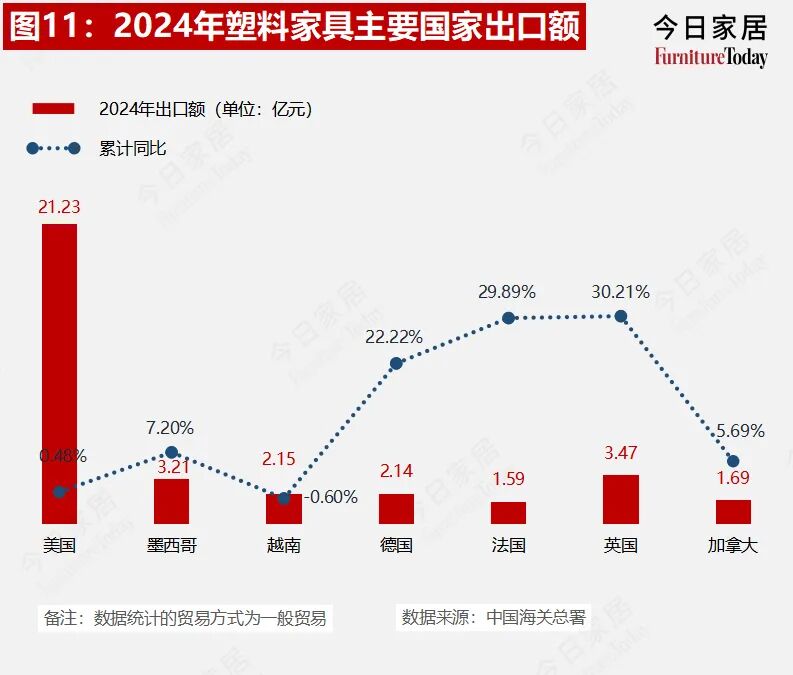 2024年塑料家具累计出口额96.38亿元,同比增长14.17%。美国和马来西亚是该品类最大的出口国,占总出口额比重22%和9%。欧洲增长较快,德国同比增长22.22%,法国同比增长29.89%,英国同比增长30.21%。