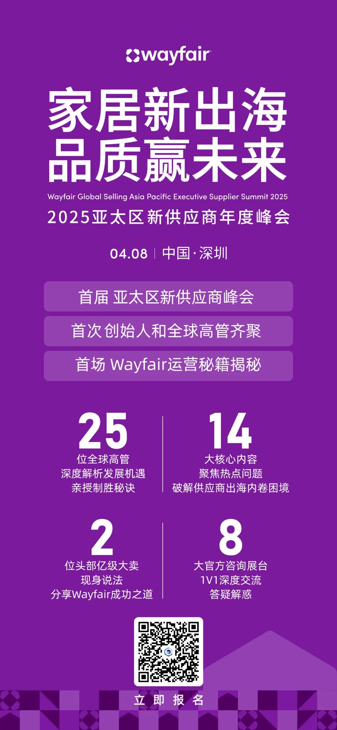 Wayfair 首届亚太区新供应商峰会重磅来袭!2025 年,跨境家居市场充满挑战,供应商面临内卷与盈利难题。如何在全球变局中突围?Wayfair 汇聚 25 位全球高管,深度解析 14 大核心议题,为供应商带来最前沿的增长策略与成功经验!