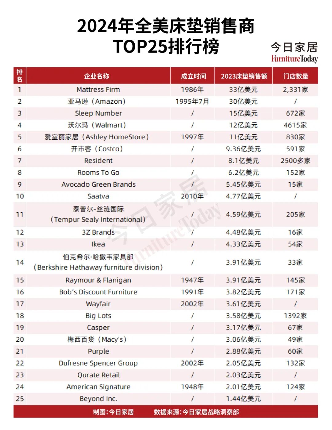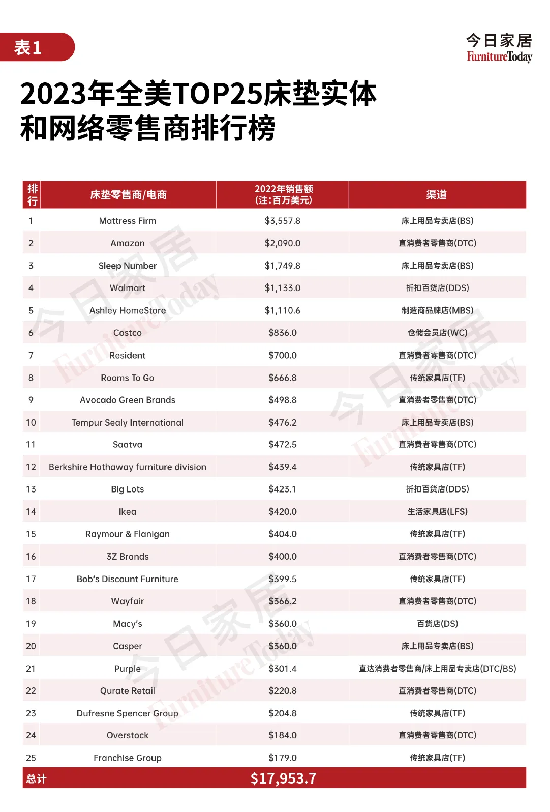 延伸阅读:2023全美床垫销售商TOP25排行榜,总额179亿美元、三巨头地位稳固!
