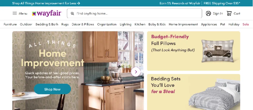 Wayfair 成立于 2002 年,通过五个不同的品牌进行销售:Wayfair.com、Joss & Main、AllModern、Birch Lane 和 Perigold。该公司提供来自 20000 家供应商的 3000 多万种产品。2023 年,Wayfair美国净收入为105亿美元。提供的床垫品牌包括Sealy、Signature Design by Ashley、席梦思、Beautyrest、Zinus、Casper、Bear和自有品牌 Wayfair Sleep和Nora。该公司还销售基础床架与可调节床架。