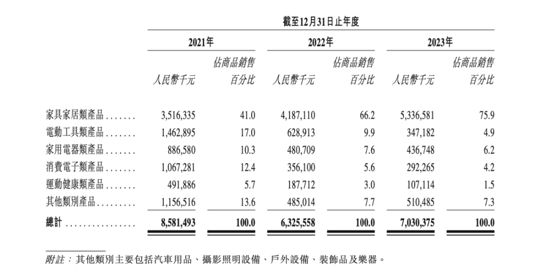 招股书显示,2023年,傲基科技的商品销售结构中,床柜桌椅等家具家居类产品的占比高达75.9%。