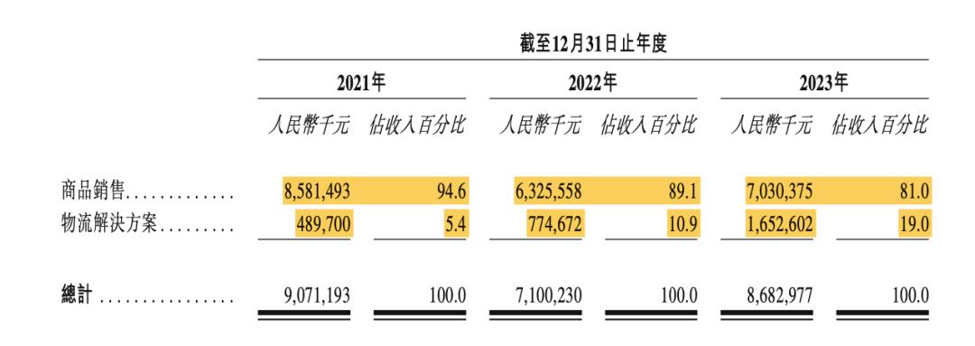 除了商品销售业务之外,物流服务开始成为傲基科技未来增长的第二曲线,招股书显示,2021年~2023年,物流解决方案的收入分别为4.90亿元、7.75亿元和16.53亿元,分别占比5.4%、10.9%和19.0%。