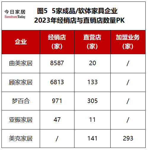 另外,今日家居统计了其中5家企业的经销店与直营店的数量(敏华与喜临门并未透露经销店、直营店的具体数量,因此并未在表中呈现)。