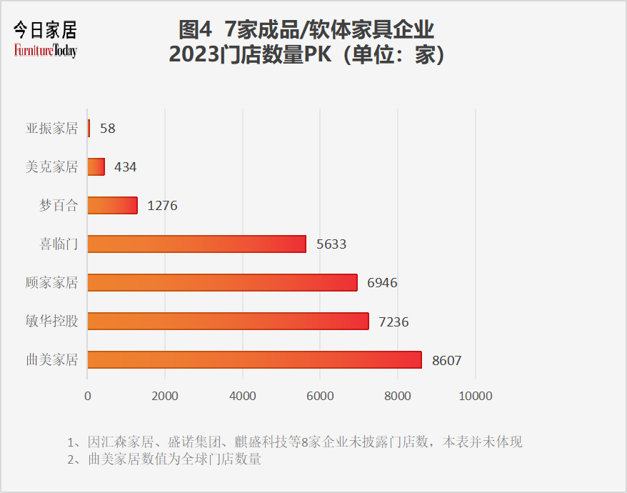 曲美家居、敏华控股、顾家家居、喜临门4家企业,以超出4000家门店数量,摇摇领先梦百合、美克家居、亚振家居。