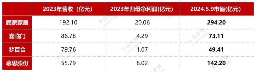 截止2024年5月9日,四家企业市值分别为:顾家家居294.2亿元,喜临门73.11亿元,梦百合49.41亿元,慕思股份142.20亿元。