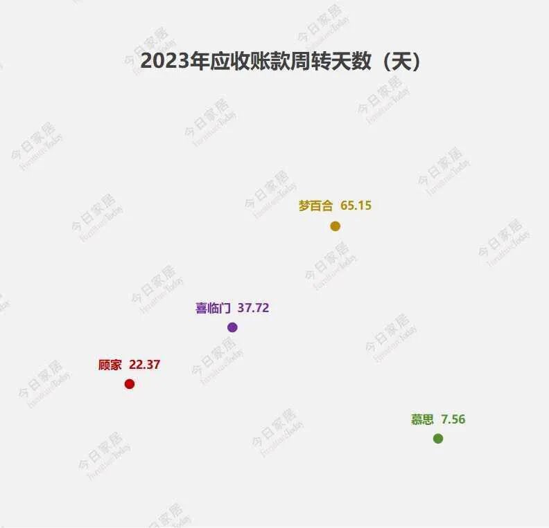 四家企业2023年应收转款周转天数分别为:顾家家居22.37天,喜临门37.72天,梦百合65.15天,慕思股份7.56天。