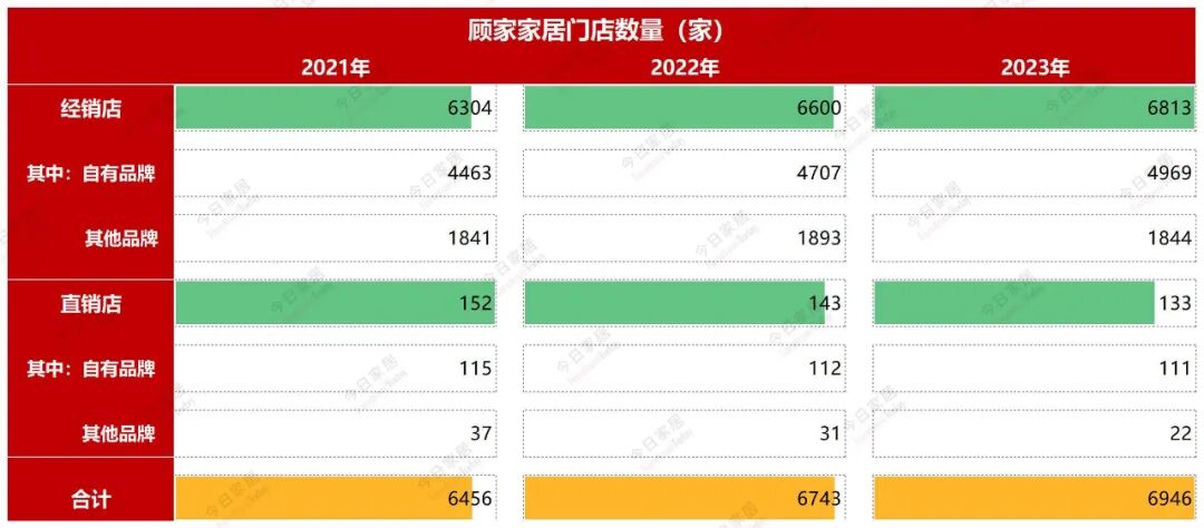 2023年顾家家居的门店数量有6946家,比上年度增加203家。其中经销店6813家,比上年度增加213家;直营店133家,比上年度减少10家。