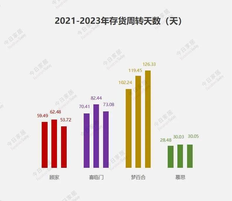 今日家居通过横向对比四家企业存货周转天数,排序四家企业的存货周转天数,从大到小分别是 梦百合>喜临门>顾家家居>慕思股份。