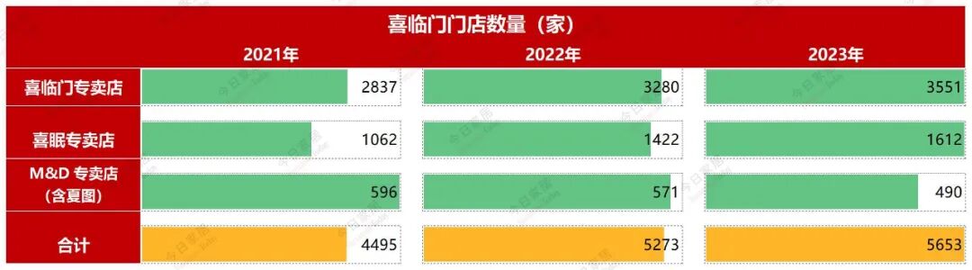 2023年喜临门的门店数量是5633家,比上年度增加380家。其中喜临门专卖店3551家,比上年度增加271家;喜眠专卖店1612家,比上年度增加190家;M&D专卖店(含夏图)490家,比上年度减少81家。