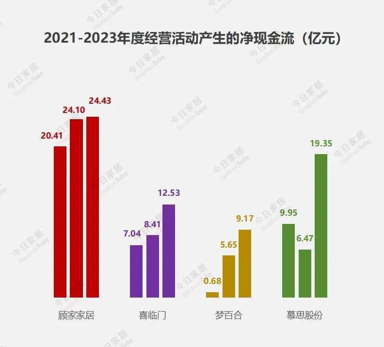 2023年因经营活动产生的净现金流分别为:顾家家居24.43亿元,喜临门12.53亿元,梦百合9.17亿元,慕思股份19.35亿元。慕思的营收总额为顾家营收总额的29%,而经营活动产生的净现金流却是顾家的79%。